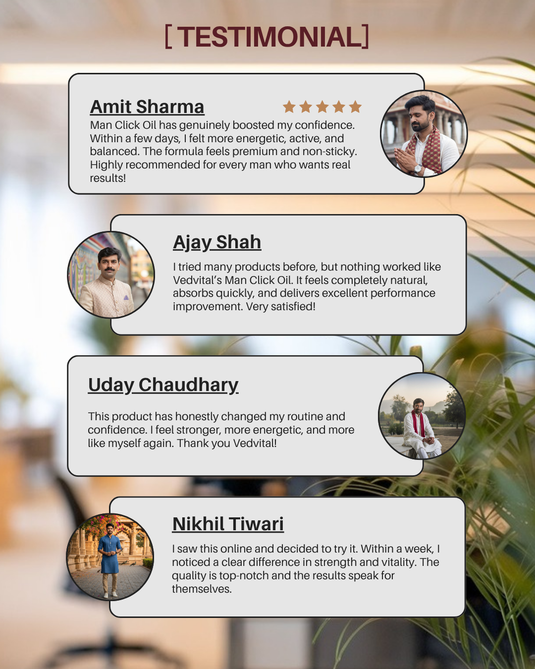 Man Click Oil by Vedvital Ayurveda is a powerful, traditional Ayurvedic topical formulation specifically designed for men seeking to support and enhance their natural physical performance and stamina. This potent oil is rich in classical herbs known for their deeply penetrating and strengthening properties.